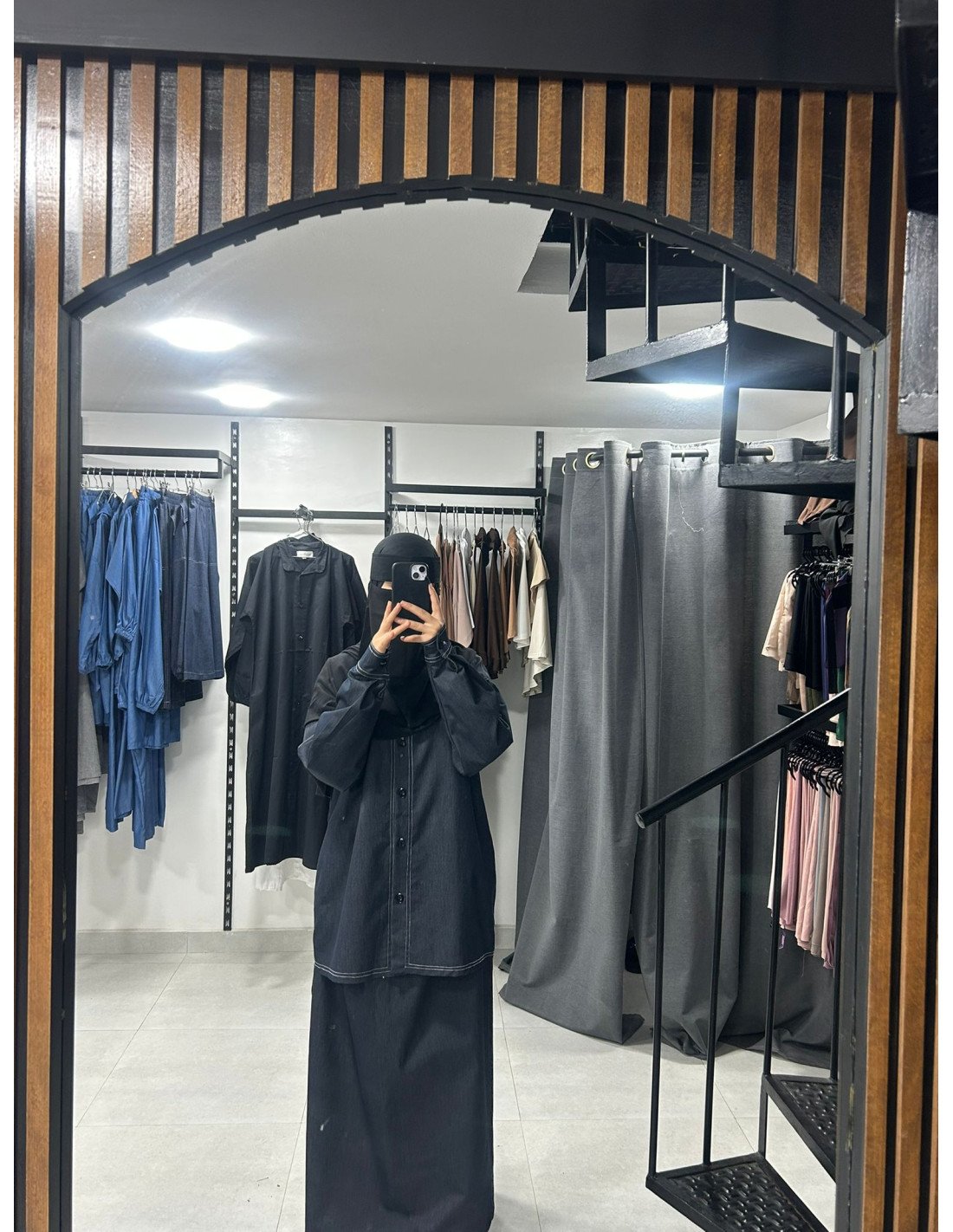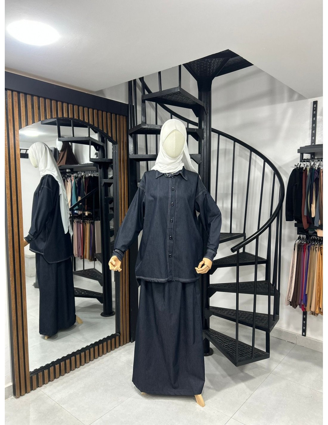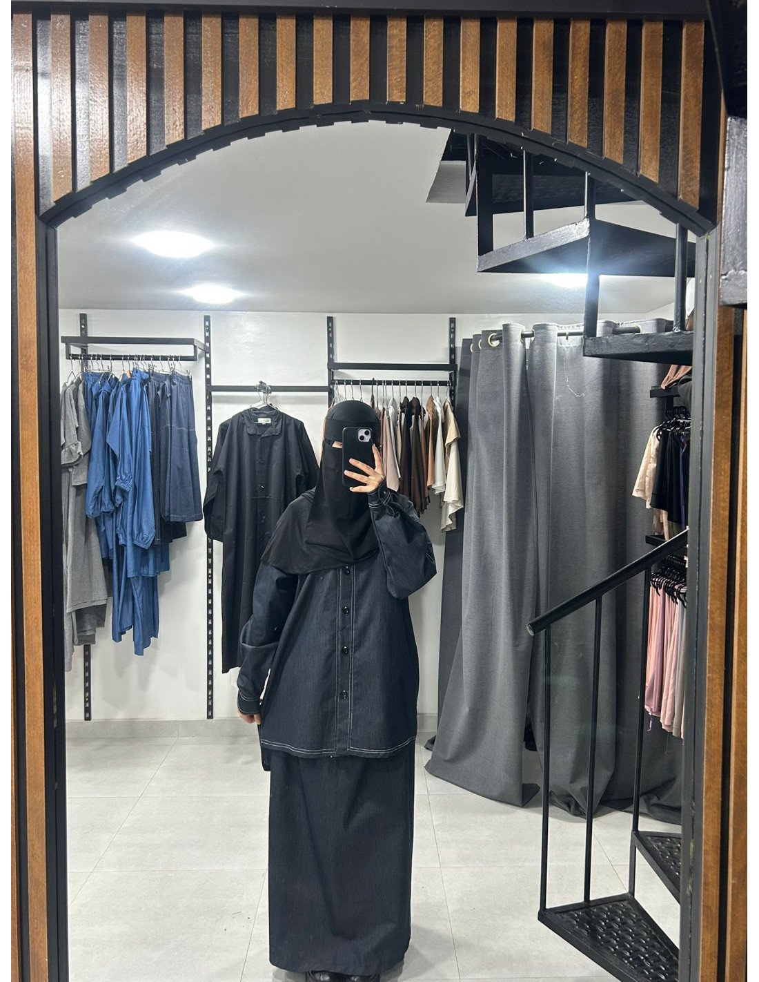 Cet ensemble jupe et chemise en jean allie sobriété, couvrance et confort.